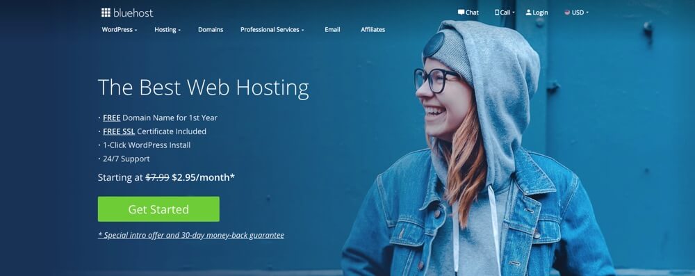 Last up is Bluehost. This shared hosting provider isn’t fancy, but it is budget friendly. And if offer perks like free domain registration for the first year, up to 25 subdomains, free SSL, 1-click WordPress installation, 24/7 support, and unmetered bandwidth – all in the basic plan. If you upgrade added features for Office 365 mailbox, site backups domain privacy and a dedicated IP address are available.